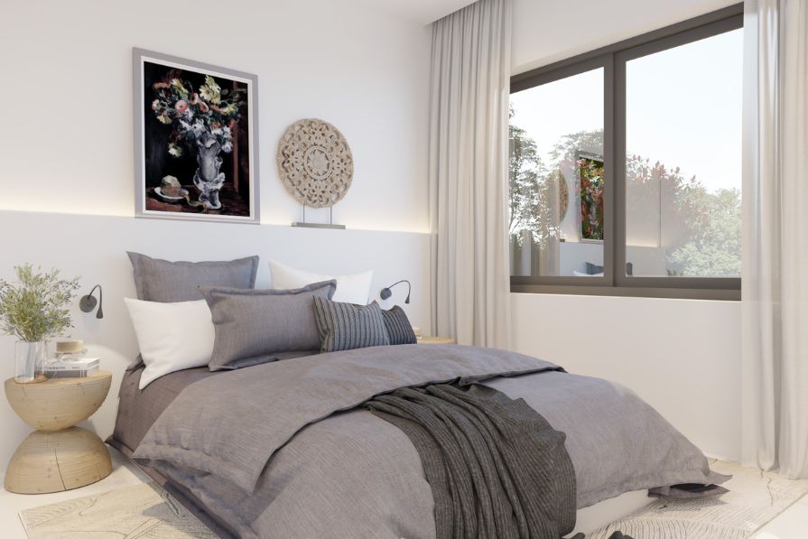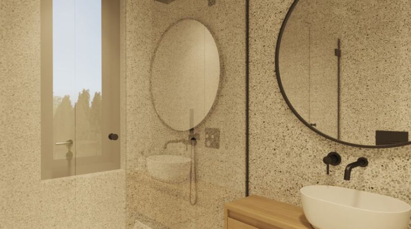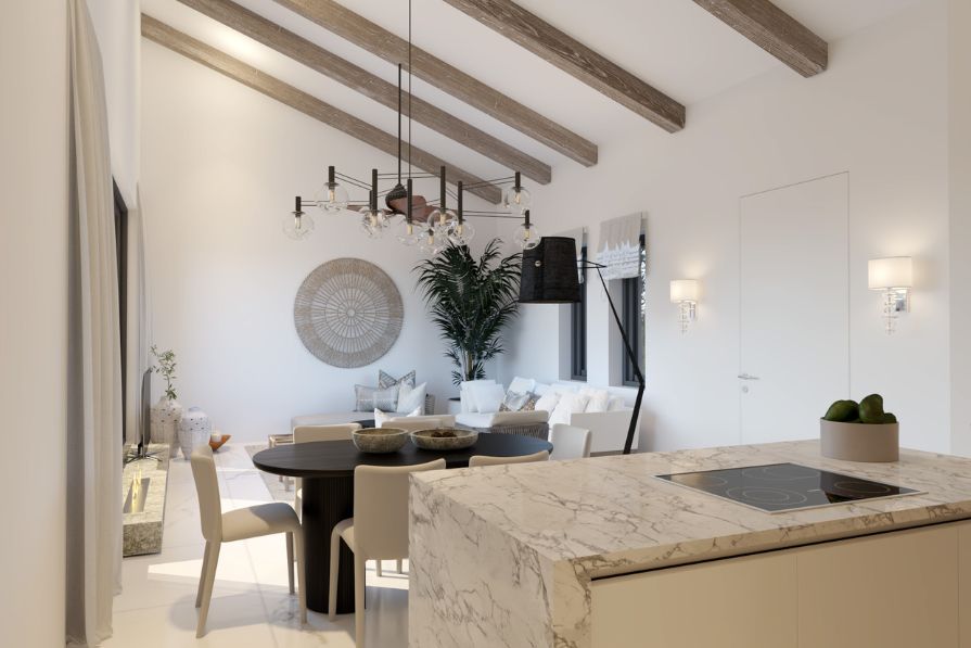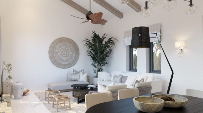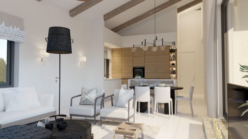 The small community of just fifteen homes boast beautiful architecture and interior design, both internally and externally, with the use of high-quality materials. The open-plan design of the villa creates an inviting atmosphere. The modern kitchen with a stylish kitchen island creates a stunning feature and a spacious dining area and lounge look out to the private garden and outdoor seating area. The ceilings are sloped with wooden beams showcasing unique character throughout the living space.