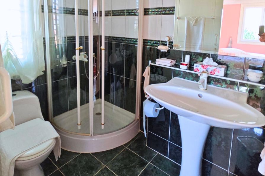 The first floor consists of three double bedrooms, all generously sized, with the master bedroom boasting an ensuite bathroom and veranda with lovely views of the pool and garden. There is also a family bathroom on this level.