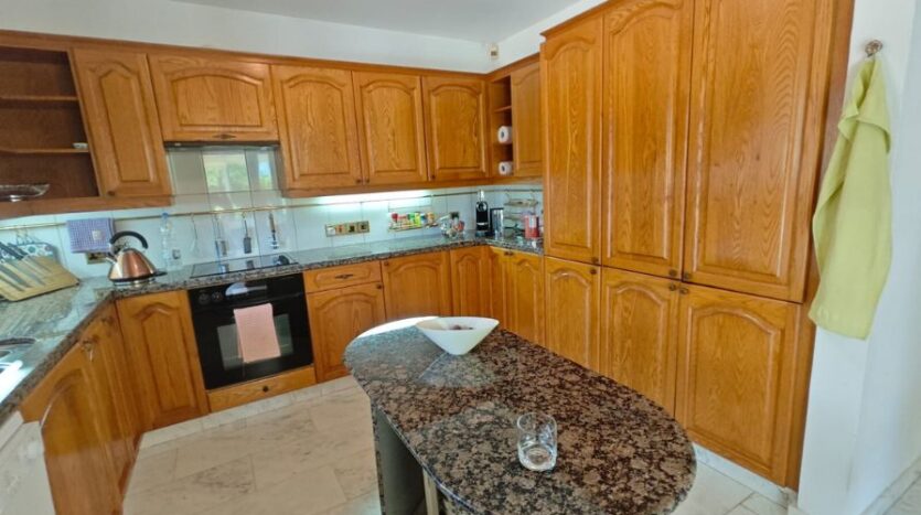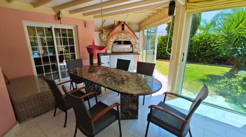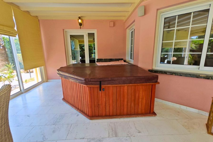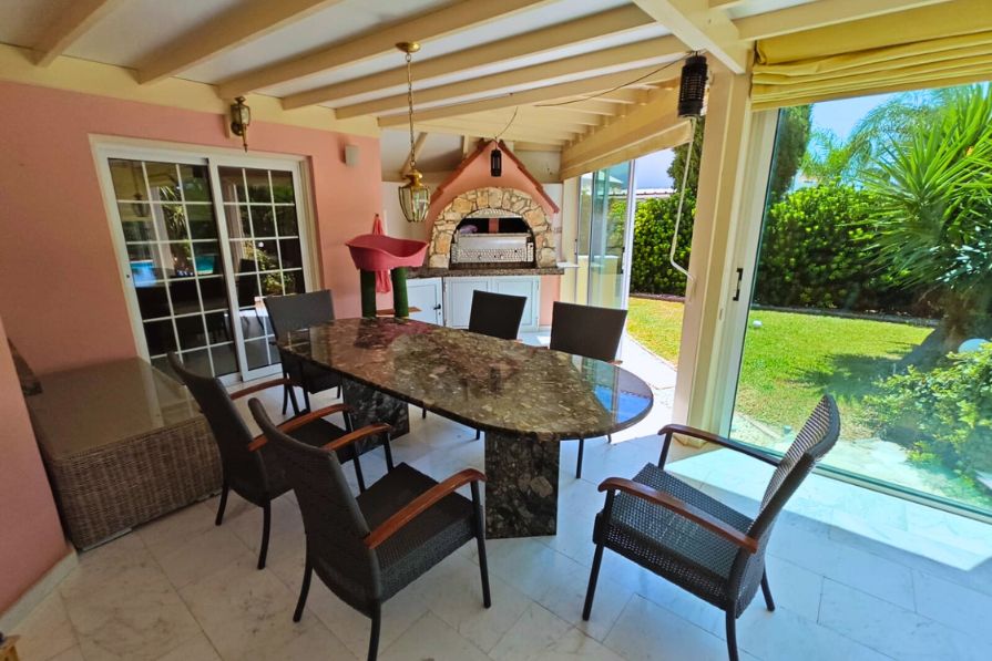 Relax outdoors in the covered area which benefits from sliding doors, offering respite from the weather, and an indoor/outdoor feel. The garden is landscaped with mature trees adding to the privacy, and the swimming pool is large and inviting – the perfect way to enjoy your Mediterranean lifestyle.