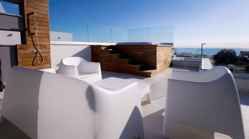 Upstairs, two beautifully appointed ensuite bedrooms occupy the first floor, while the third ensuite bedroom is situated on the second floor — adjacent to a stunning roof terrace complete with a relaxing jacuzzi, offering panoramic views and an ideal space to unwind.