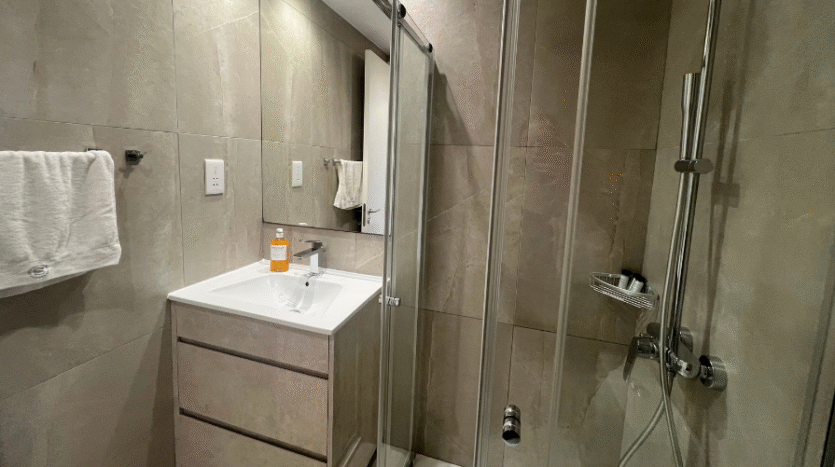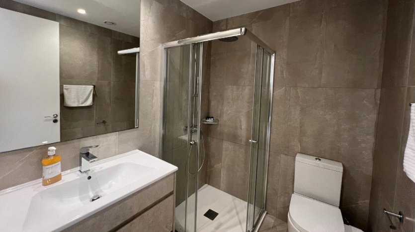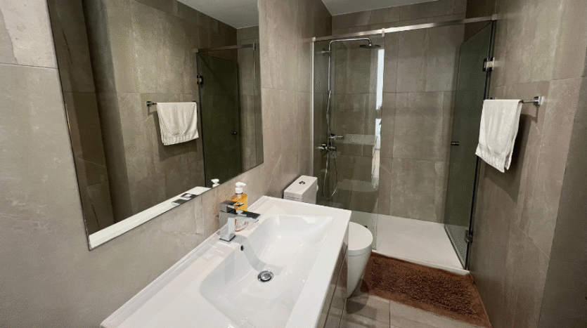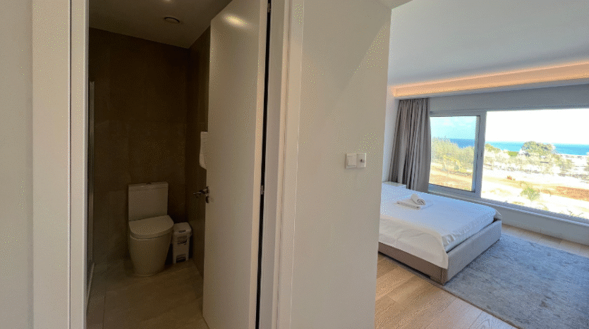The main bedroom includes an en suite with a shower and large windows that frame beautiful sea views. The second bedroom has access to the main bathroom with a shower, along with large windows and a sliding door that leads directly to the balcony. The third bedroom features its own en suite with a shower and two windows that fill the room with natural light while offering inland views.