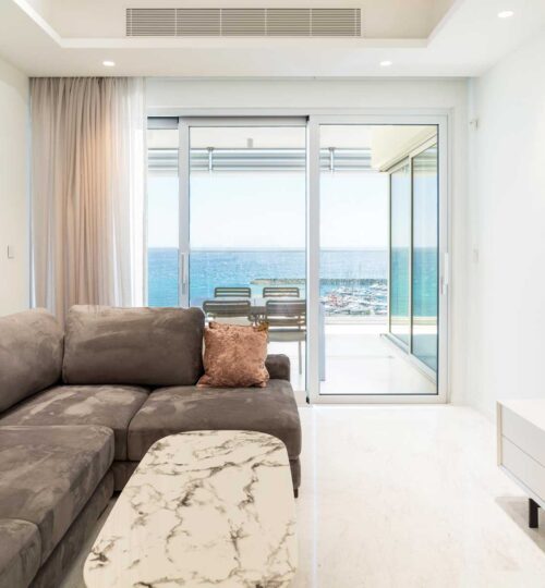Inside, the apartment features an open-plan layout with a central kitchen and dining area, guest WC, and en-suite shower. Both bedrooms include fitted wardrobes, while high ceilings and floor-to-ceiling windows fill the space with natural light and highlight the breathtaking sea views.