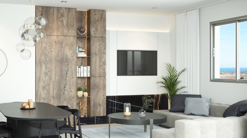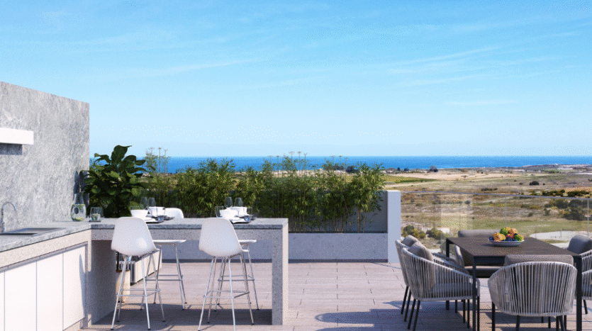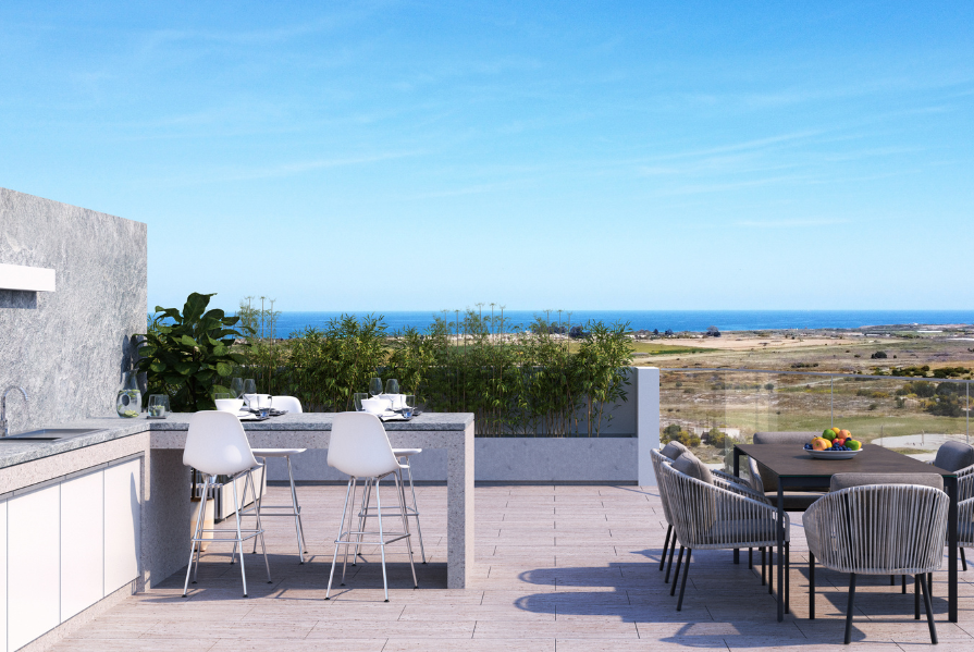 The property offers a 20m² covered veranda—ideal for relaxing or entertaining—as well as an impressive 65m² private roof garden that boasts an outdoor built-in kitchen area with sink, perfect for gatherings under the Cyprus sun. From here, enjoy beautiful sea views and an elevated sense of tranquillity.